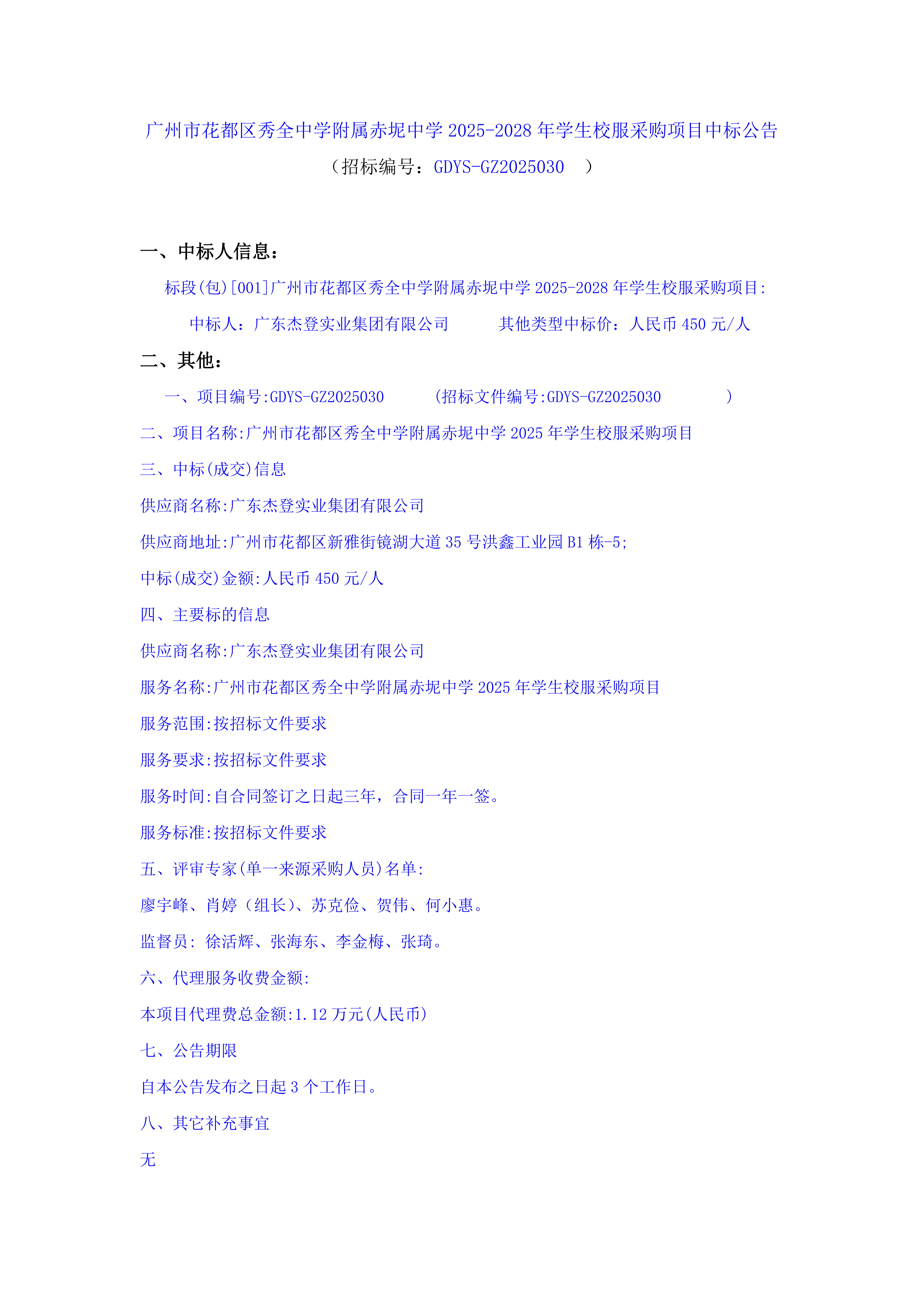 广州市花都区秀全中学附属赤坭中学2025-2028年学生校服采购项目中标公告